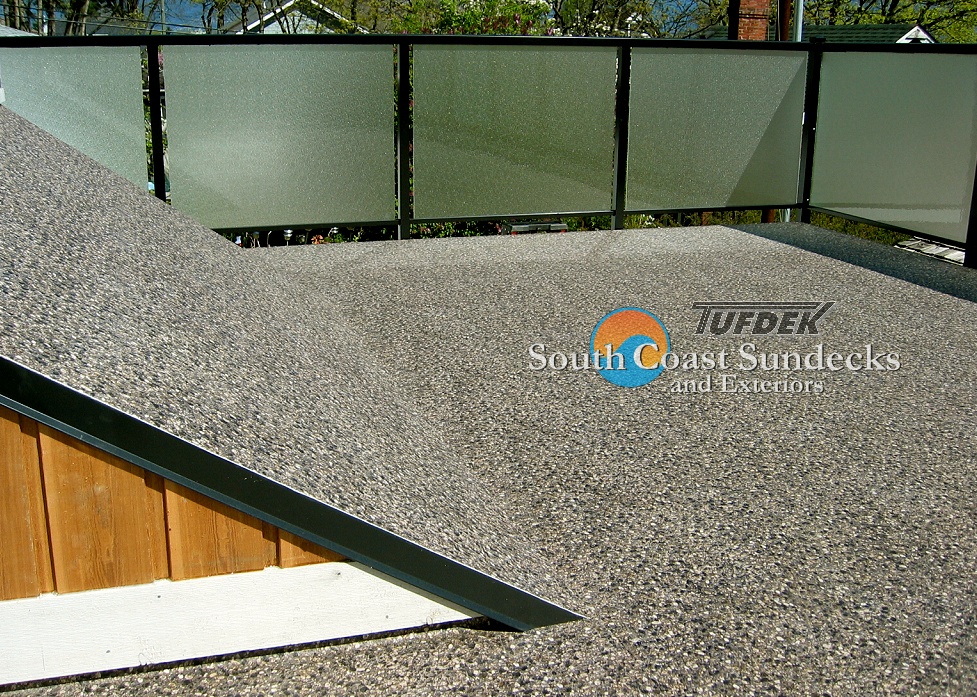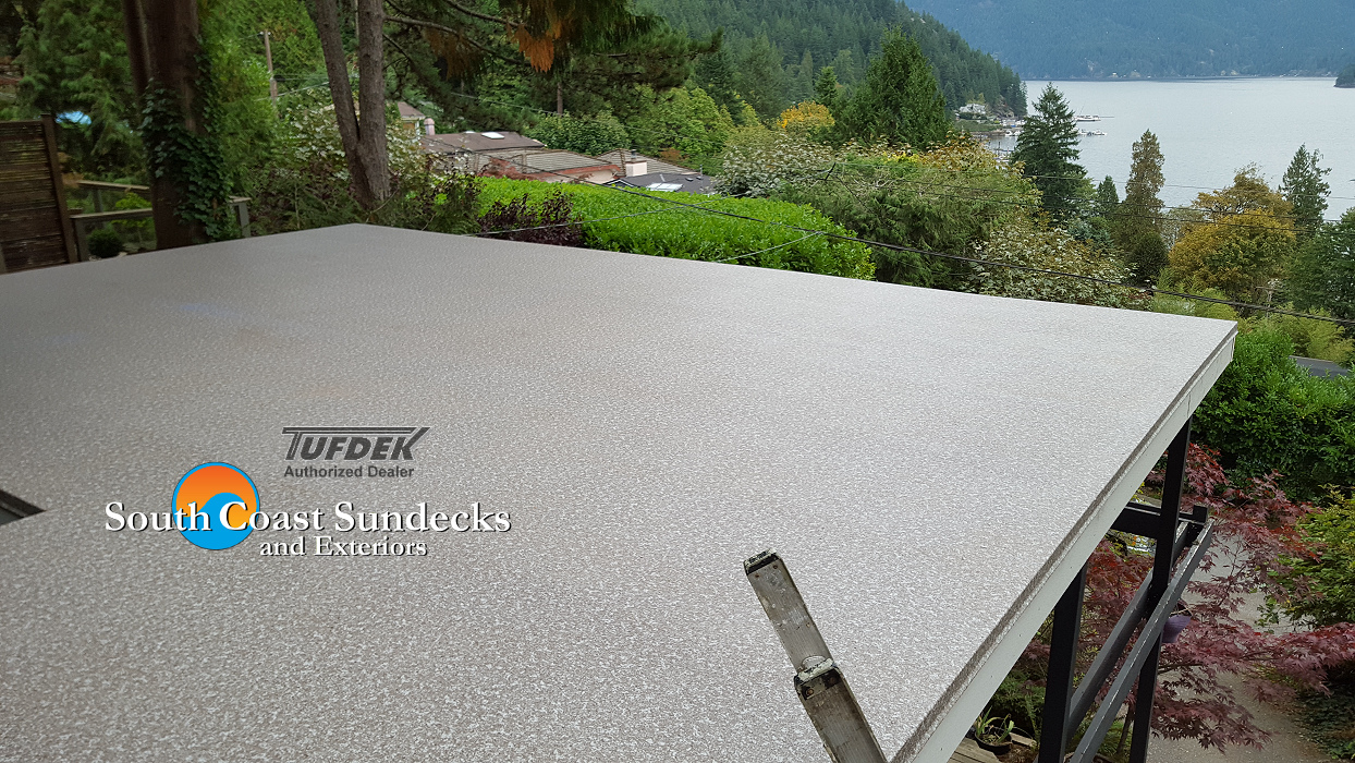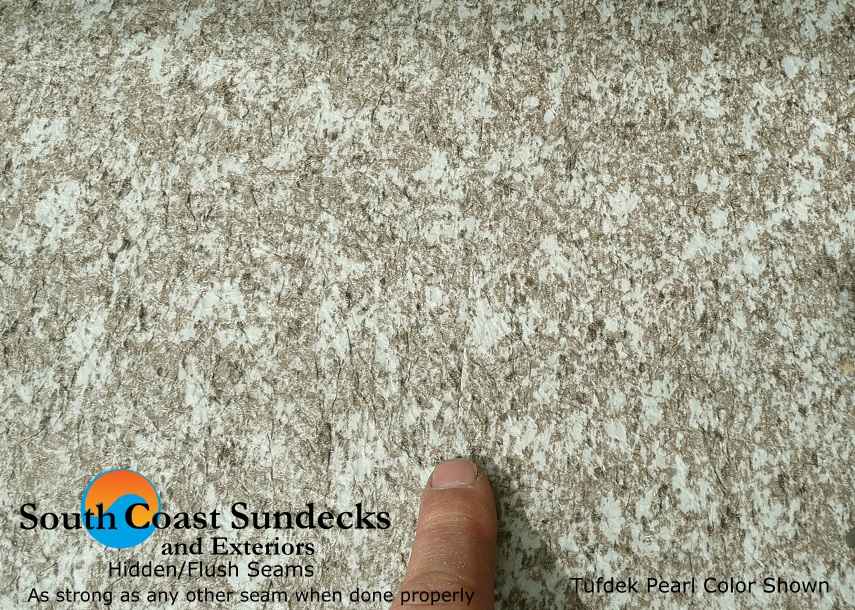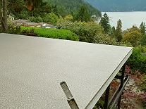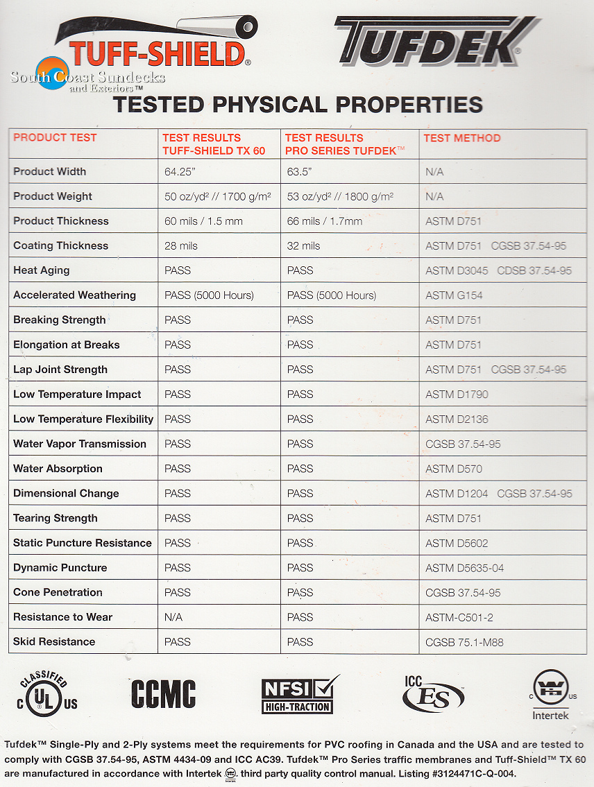 Tufdek Designer & Supreme Series costs a little more because of the additional manufacturing processes with resulting durability, appearance and longevity benefits that more importantly have exceeded all national testing requirements set forth by Canadian building code regulations that includes over all living spaces making it an approved roofing membrane! Our 'Flush seams' or 'Recessed seams' can be strong as the vinyl itself because we know how to do them properly. Tufdek 15 year warranty vinyl decking doesn't delaminate, shrink, tear or pull apart unlike other lower cost vinyls and its texture is the easiest to keep clean over other deck membranes where some have surfaces so porous that they attract and trap algae and bacteria which can cause premature failures and surface discoloration. Vinyl sheet decking in general cannot be compared in anyway to liquid/trowel-on/roll-on membranes where 99% are Not Canadian Building Code approved for over living spaces which may be testament to why you shouldn't consider them for your deck project. As a professional vancouver waterproofing deck company these products are very profitable for us to use but we choose not to offer them to our customers for a multitude of reasons. If your still in doubt please ask us for more information on them or contact your local municipalities building inspectors and ask them. Be Suspicious of Non-Dealer supported companies with vinyl membranes made off shore that are inferior in quality and circumnavigate all stringent north american enviromental regulations and building code product testing that are not always less expensive. We replace these membranes often with customer complaints being the ink patterns substantially wear off in a couple of years as well as seam failure leaks and product tear leaks that leed to subsrrate and structural damage. Non reinforced vynils also shrink substantially that causes the drip edge flashing to pull upward causing water to pool along the decks edge where unsightly dirt also ends up being deposited. |
